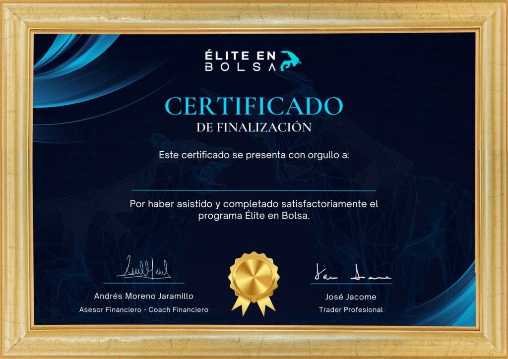 Certificado de finalización: Cuando finalices tu entrenamiento, demostrarás tu conocimiento y compromiso con un certificado oficial que valida tu preparación en estrategias de inversión y gestión financiera.